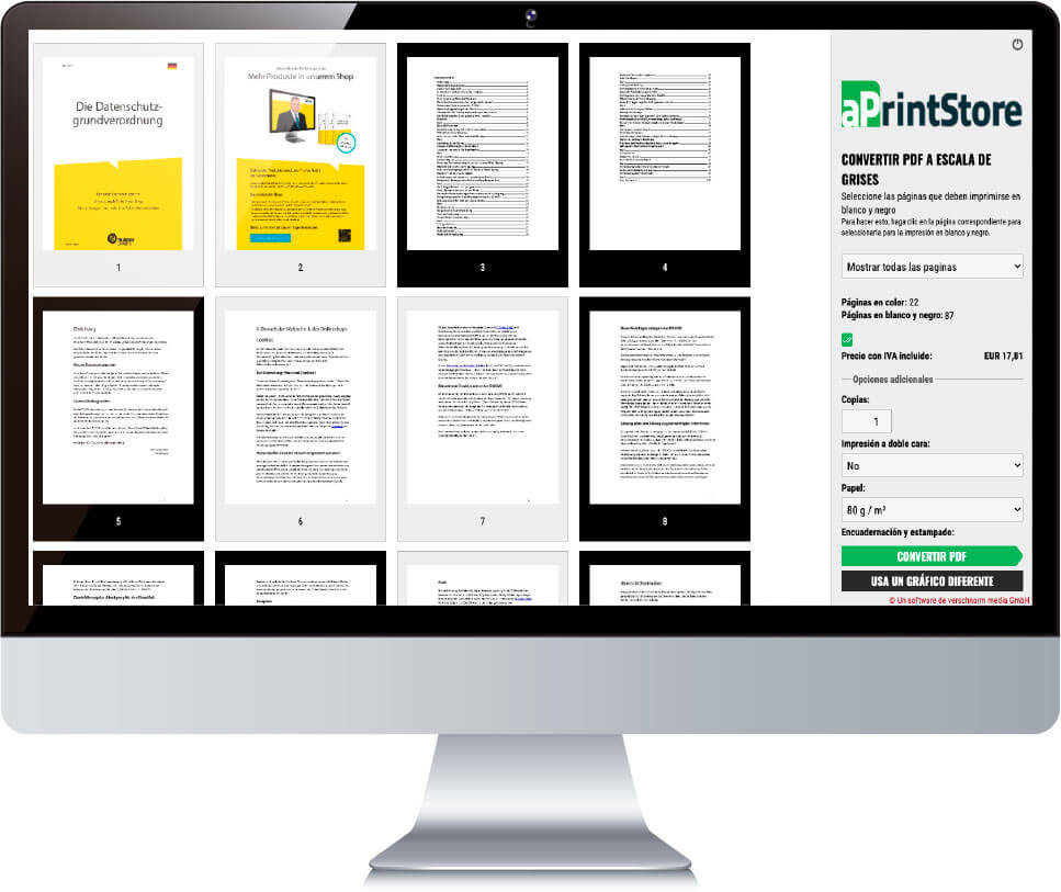Mit diesem Werkzeug können Kunden ihre PDF-Projekte direkt im Shop einstellen: Dateien auswählen und zum Druck senden, Farb- und Schwarzweißseiten, Bindung, Anzahl der Kopien, Gewicht usw. einstellen.